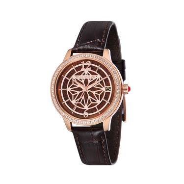 With hand-set Austrian crystal set on the bezel and the cabochon inlaid crown through to the geometrically inspired dial detail that sits above a frosted translucent dial that subtly masks the skeleton mechanics of the self-winding movement–this is a timepiece designed to transcend fashion.