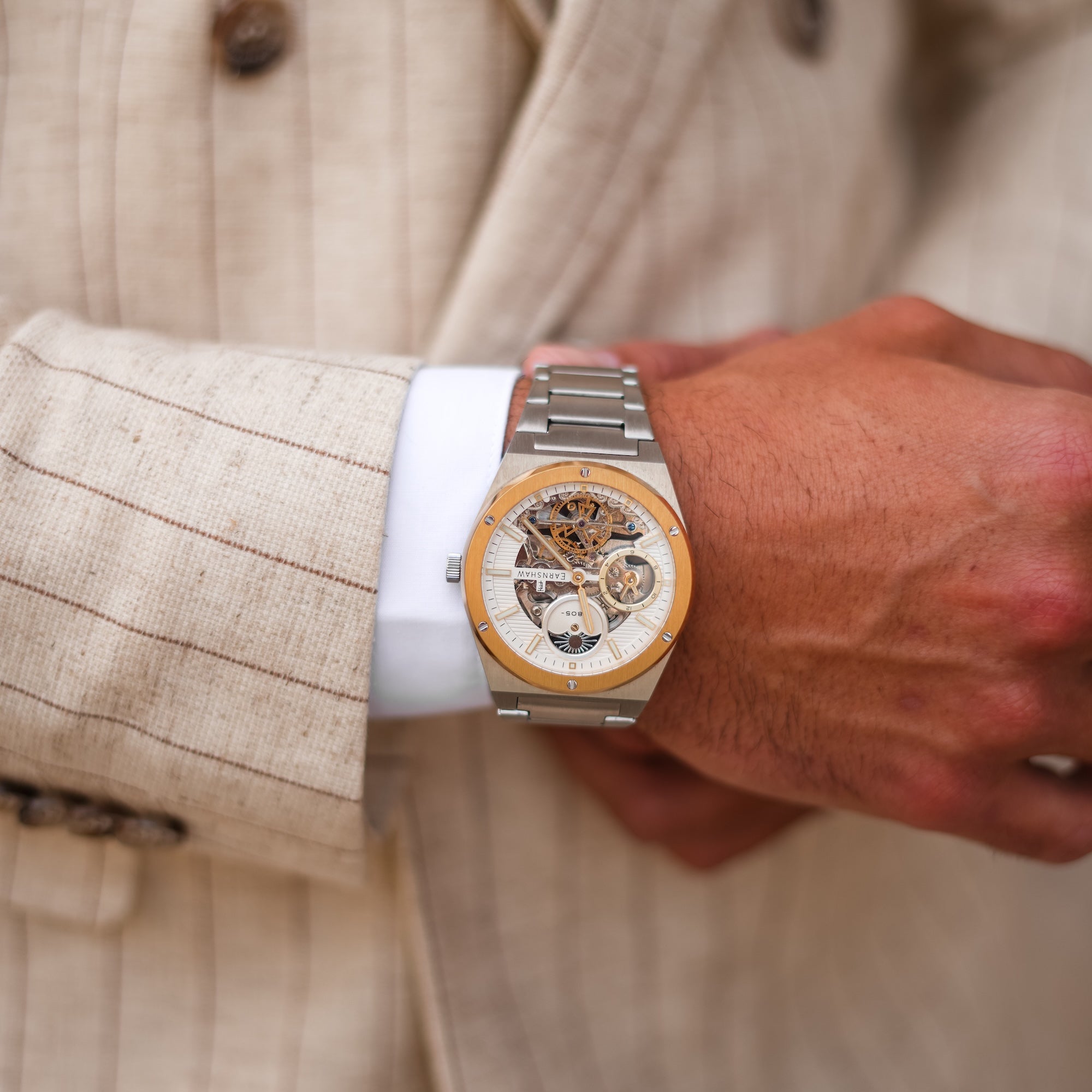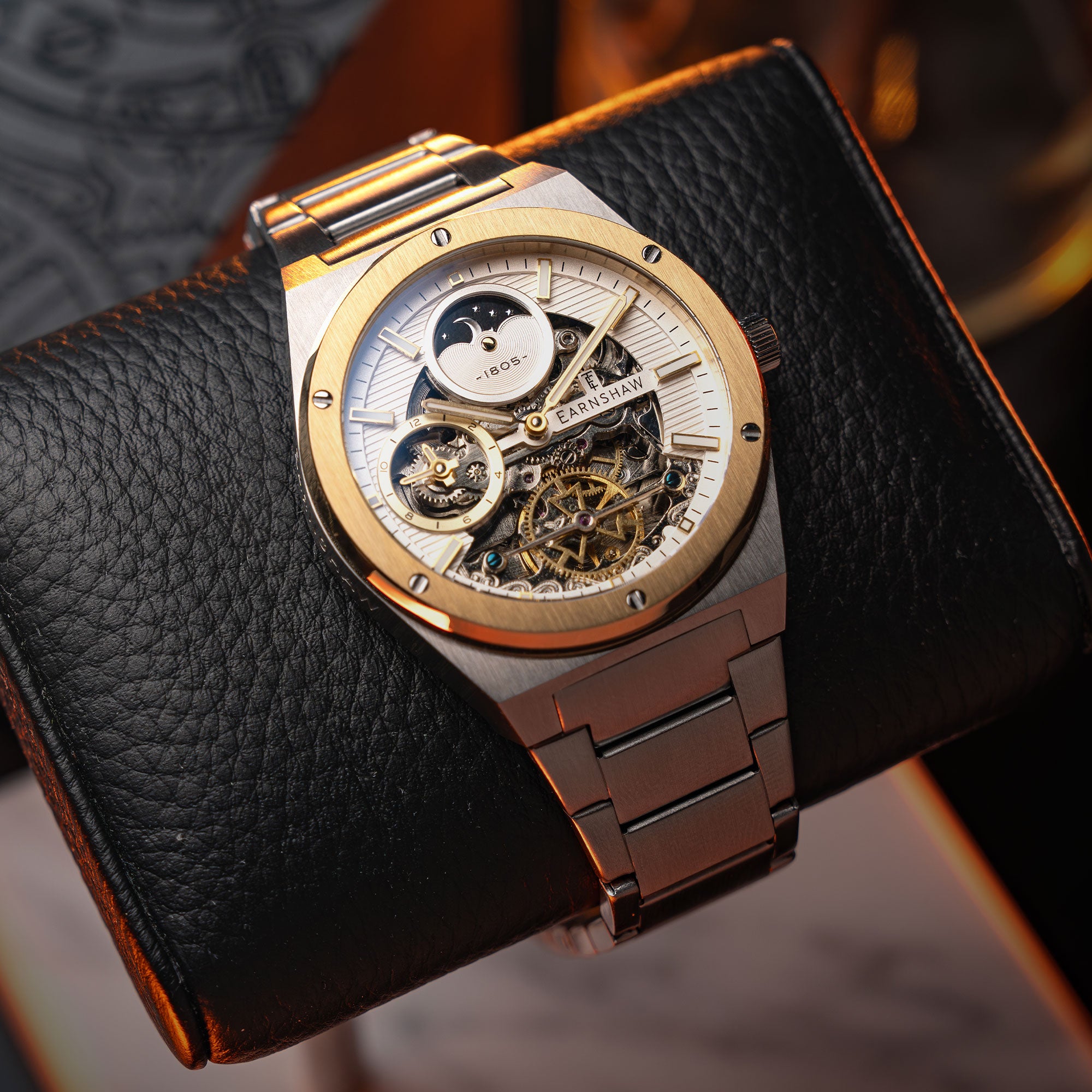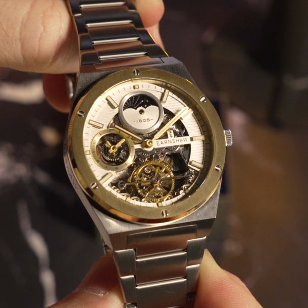 Introducing the new iteration of Drake, the collection that defines style and luxury. This timepiece exudes a clean and sporty look with its geometric case design. Its automatic movement boasts a dual time function, and the skeletonized dial adds both functional details and a touch of elegance. Experience the true expression of Earnshaw legacy with this modern and refined timepiece.