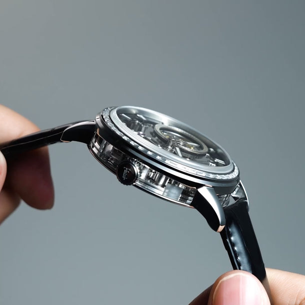 Experience the pinnacle of horological artistry with the Parsons Tourbillon. Crafted with a captivating skeleton dial, a transparent caseback, and glass side panels, the Parsons offers a mesmerising view into the intricate mechanics at its core.