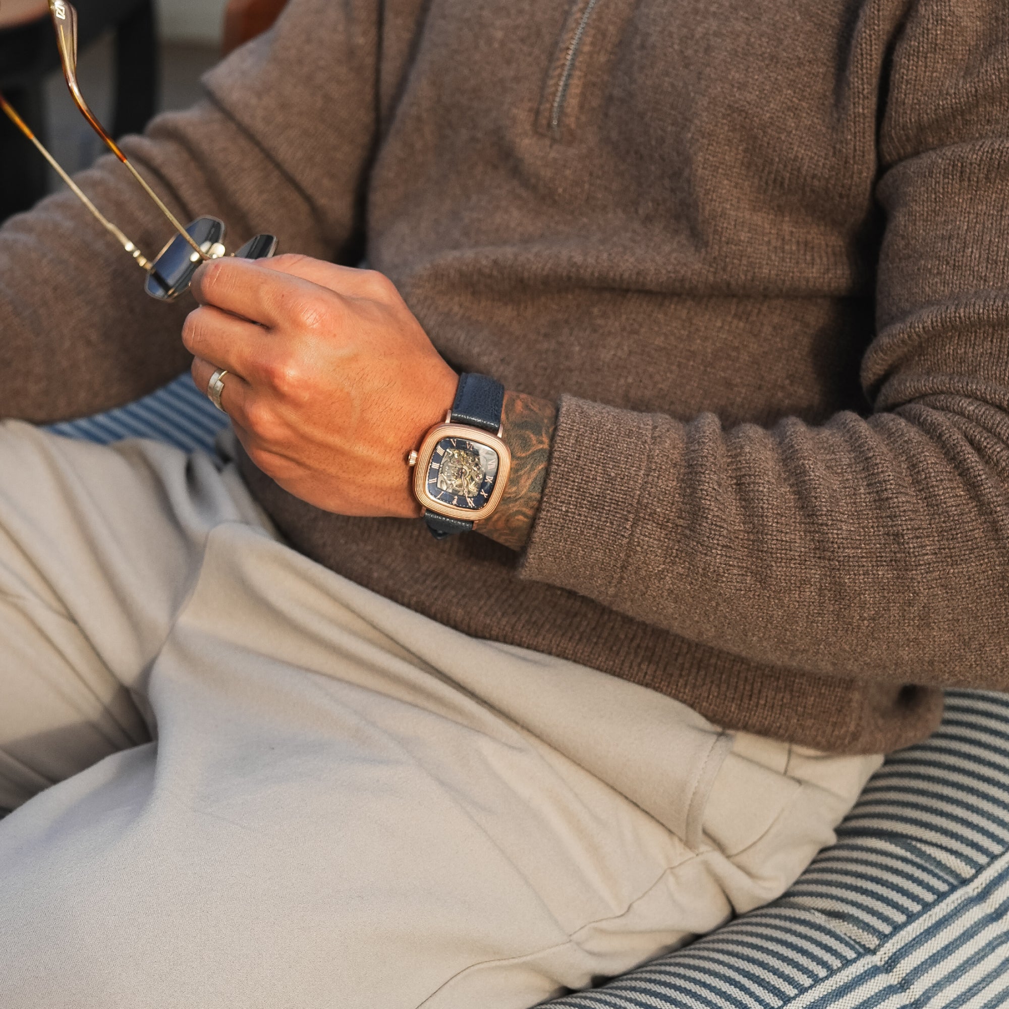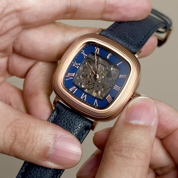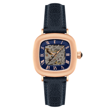 With its compact 38mm square case, the Chester is designed for balance. The timepiece also reveals its mechanical heartbeat with its skeleton dial and see-through exhibition caseback. Effortlessly refined for both everyday wear and formal elegance, the Chester brings sophistication and character together in one clean, square form.